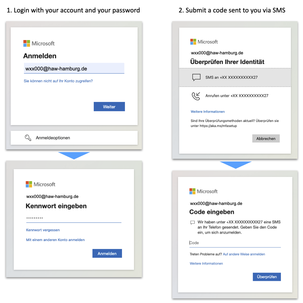 you have to provide your HAW Microsoft account (a "w" followed by two letters, three numbers and "@haw-hamburg.de") and password ("Kennwort eingeben").