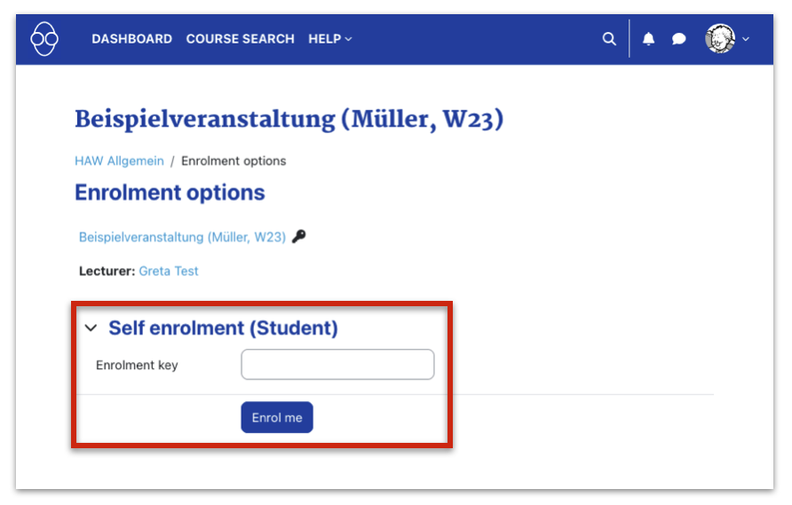 enrolment key ("Einschreibeschlüssel", a password) for enrolling yourself after you have entered the
