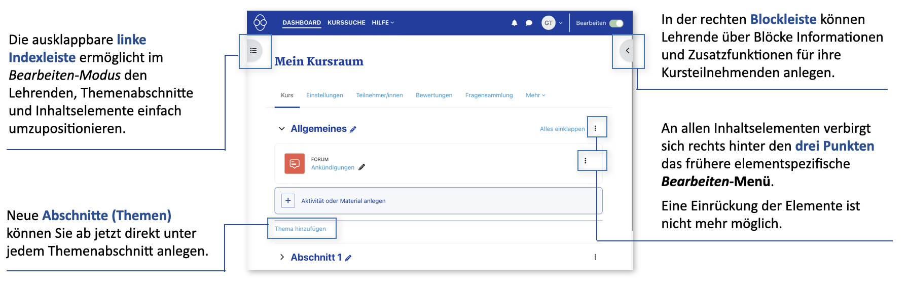 - Die ausklappbare linke Indexleiste ermöglicht im Bearbeiten-Modus den Lehrenden, Themenabschnitte und Inhaltselemente einfach umzupositionieren.