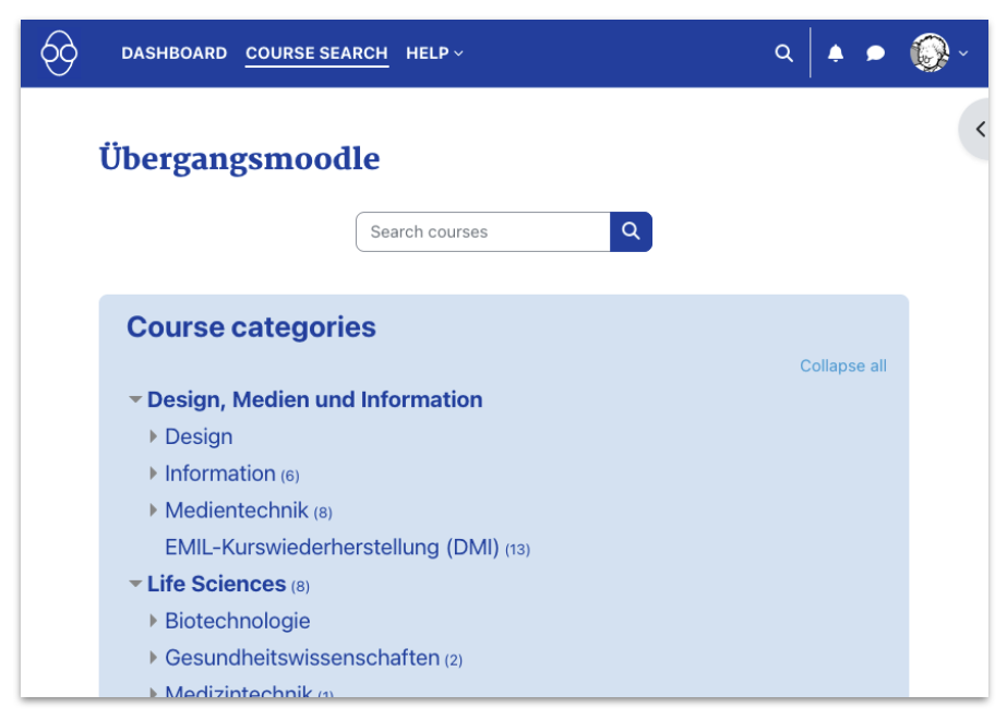 You will also find a directory of course categories that can be individually opened. These categories are organised by faculty/department and term/semester and contain all current Moodle courses.