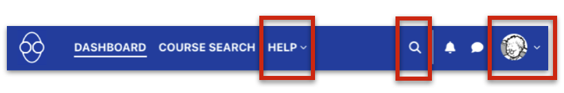The blue header menu is visible everywhere in Moodle - here you can always find your Dashboard or the Course Search.