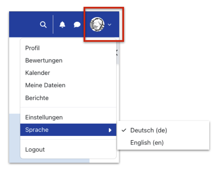Here you can edit your profile data via "Profile" (e.g. upload your profile picture) or change the language settings for the Moodle menus via "Sprache" (Language).