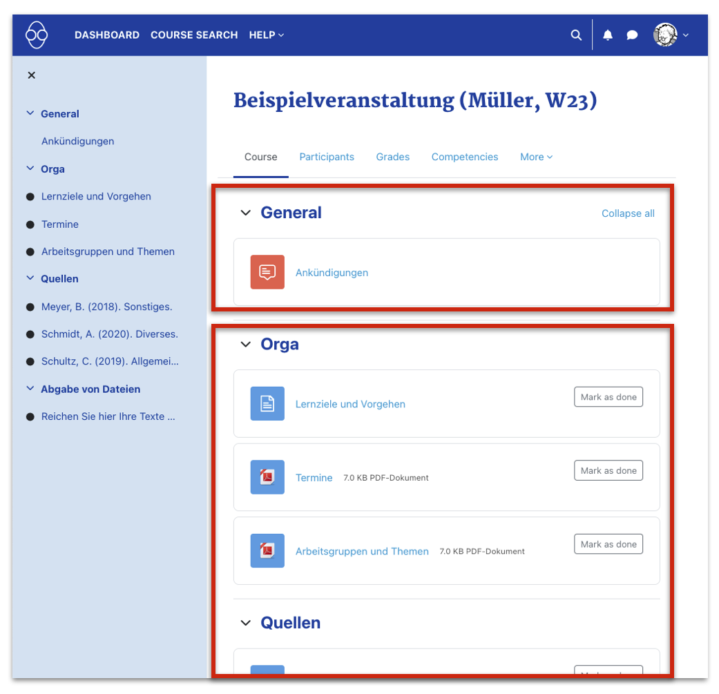 The sections form a kind of folder structure in which the actual course content is organised, for example according to event dates, topics, working groups or didactic functions.