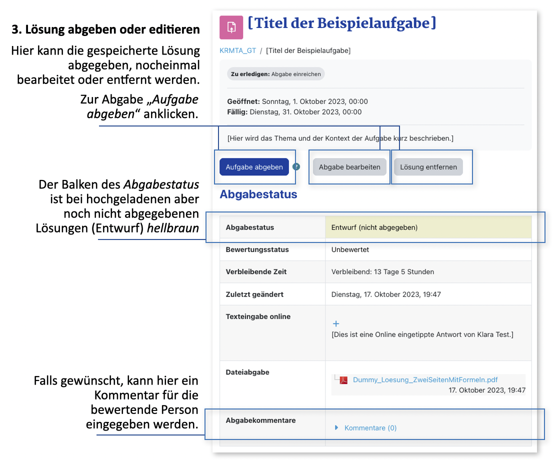 - Lösung im Entwurfszustand entweder abgeben, erneut bearbeiten oder löschen