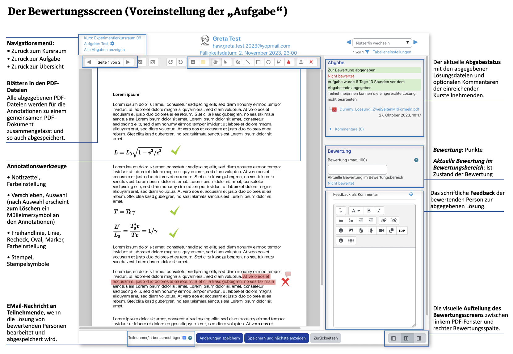 - Abgegebene Dateien im Format PDF können dabei auch in Moodle gesichtet und im Dokument annotiert werden.