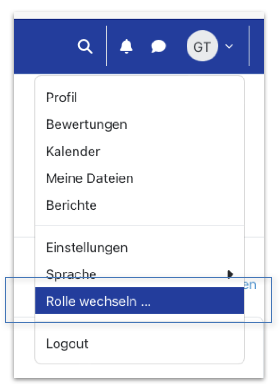 Sie können Ihre Rolle zeitweise ändern, indem Sie im Kopfzeilenmenü auf Ihre Initialen bzw. Ihr Profilbild klicken. Im sich öffnenden Menü wählen Sie über "Rolle wechseln..." die angestrebte Rolle aus.